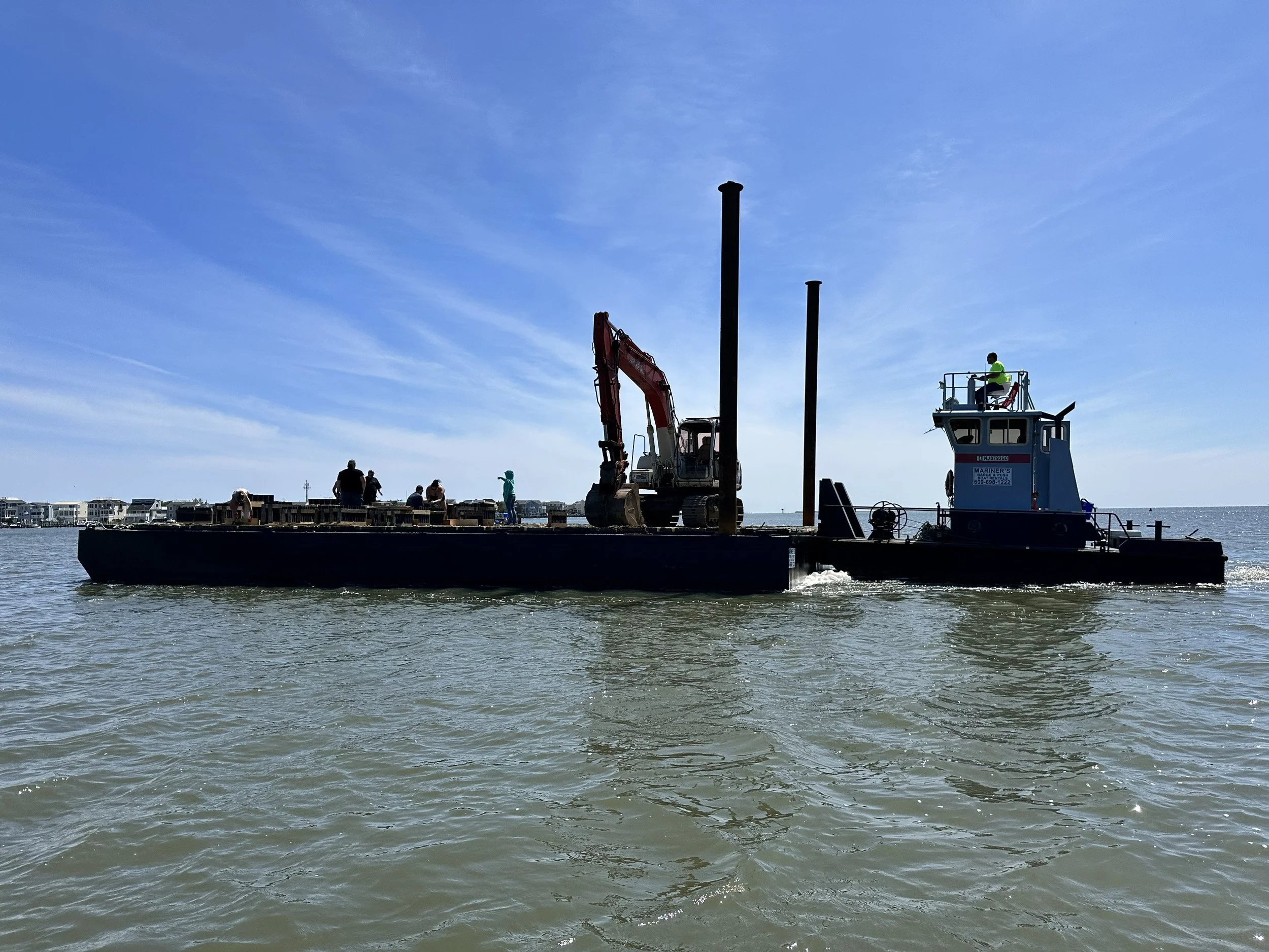 Each barge is equipped with wooden decks to accommodate cranes, excavators, and other equipment.